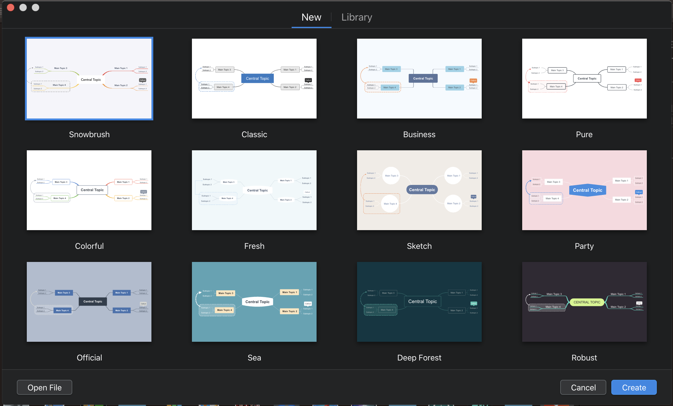 XMind 프로그램을 다운받아 실행하면 가장 먼저 테마를 고를 수 있게 되어있습니다. 화면에 보이는 테마 말고 스크롤을 내리면 더 많은 테마가 있는데 하나같이 디자인이 예쁜 것 같습니다. 한때 무수하게 많은 마인드맵 프로그램 프로그램을 다운받아 사용해본 경험에 의하면 디자인이 결코 뒤지지 않는다고 감히 말할 수 있습니다.