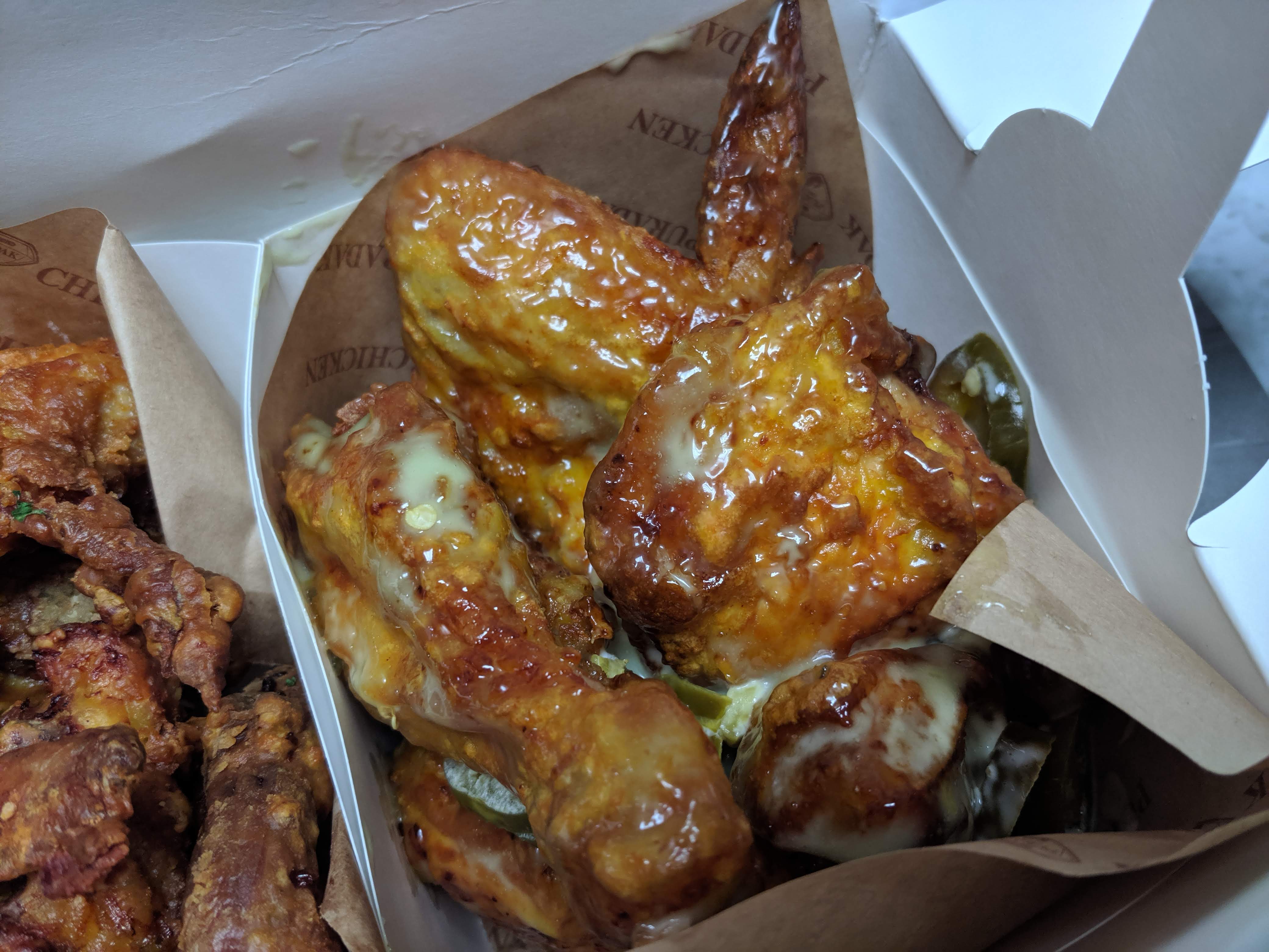 보시는 것처럼 조각이 굉장히 큼지막해서 먹음직스럽습니다. 그리고 다른 치킨처럼 튀김옷 맛으로 먹는 치킨이 아니라 육질 자체가 굉장히 맛있습니다. 물론 겉에 얇게 튀김옷이 덮혀 있긴하지만 고기 자체에 집중할 수 있을 정도이고 맛을 슬쩍 더해준다고나 할까요?