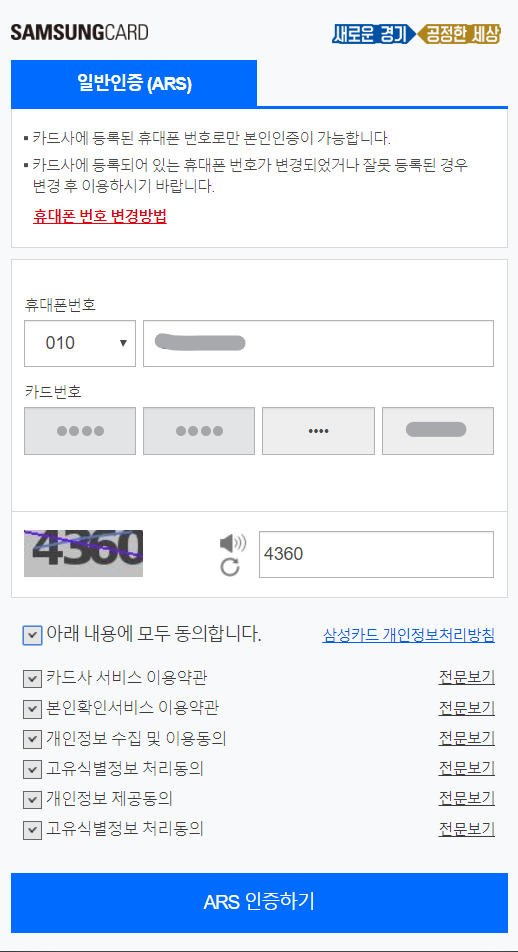 핸드폰 번호와 카드 번호를 입력하고