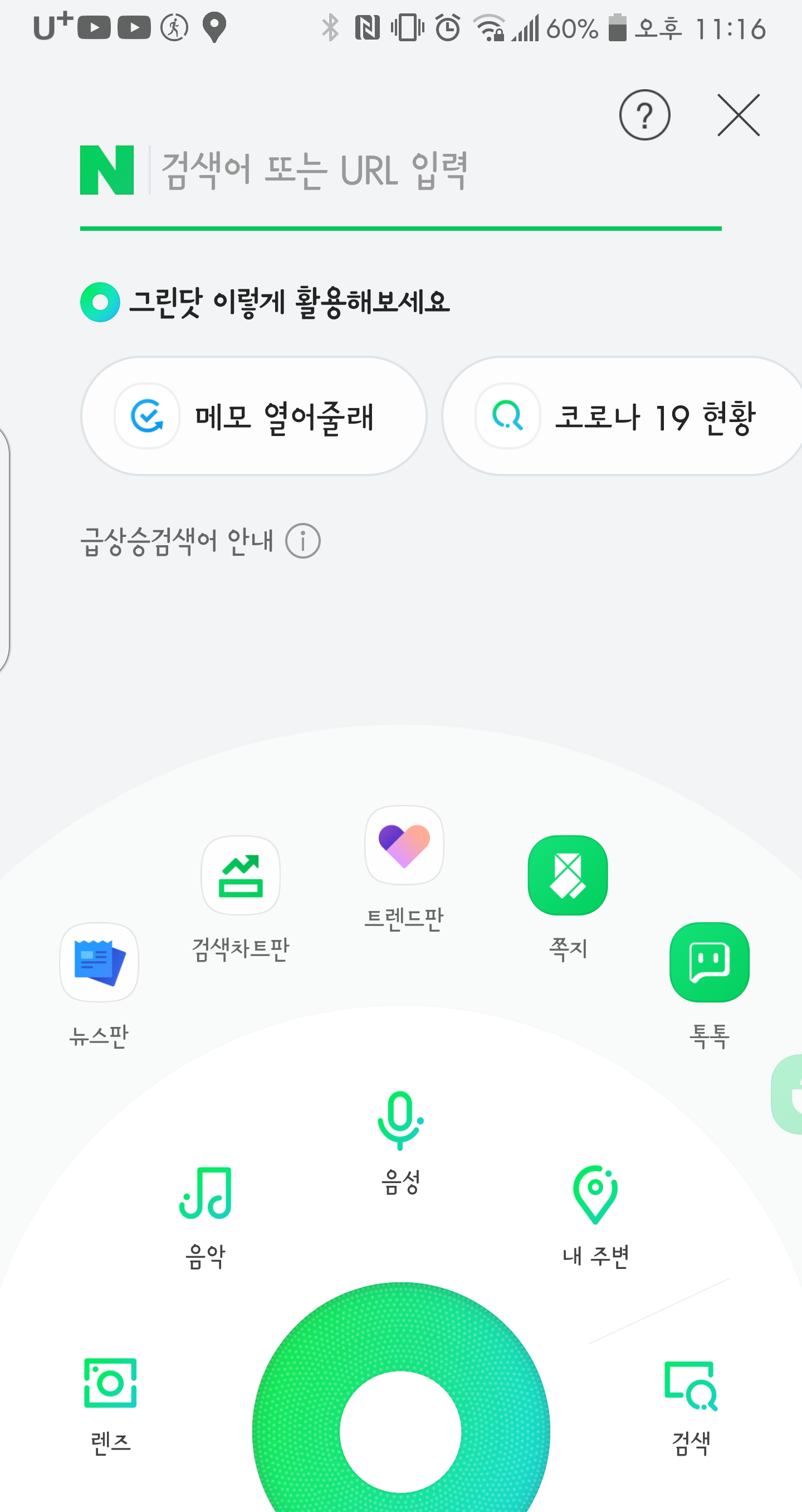 네이버 앱을 켜고 중앙 하단의 그린닷을 터치합니다.